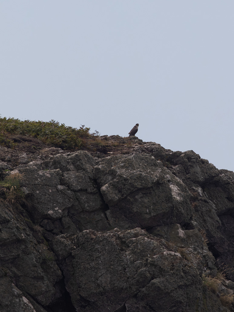 Skomer is best known for its huge colony of puffins, but it’s also home to razorbills, guillemots, gulls, oystercatchers, rabbits, and more. We were lucky enough to spot a falcon perched on a cliff face, with the help of the warden’s telescope. My camera struggled to capture it at that distance (you’ll see!), but it was a real treat to see.