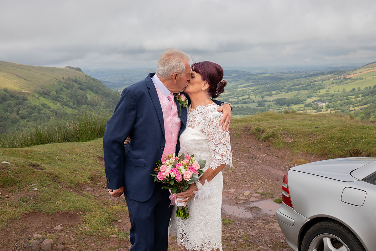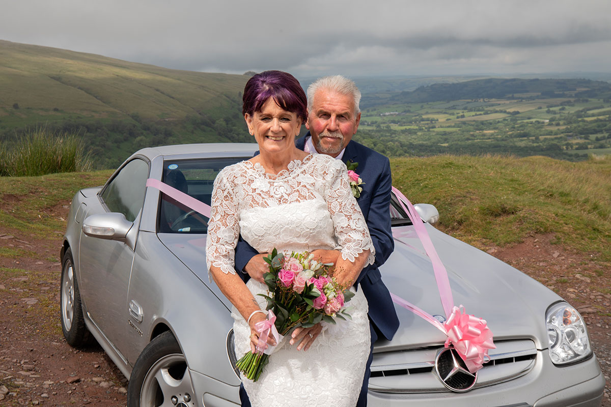 Afterwards, we ventured out for portraits in the breathtaking Brecon Beacons, one of their favourite spots. The rolling hills and sweeping skies provided the perfect backdrop, adding a sense of adventure and romance to their wedding collection. The classic silver car, decorated with pink ribbons, added a final flourish of fun and style to the day.